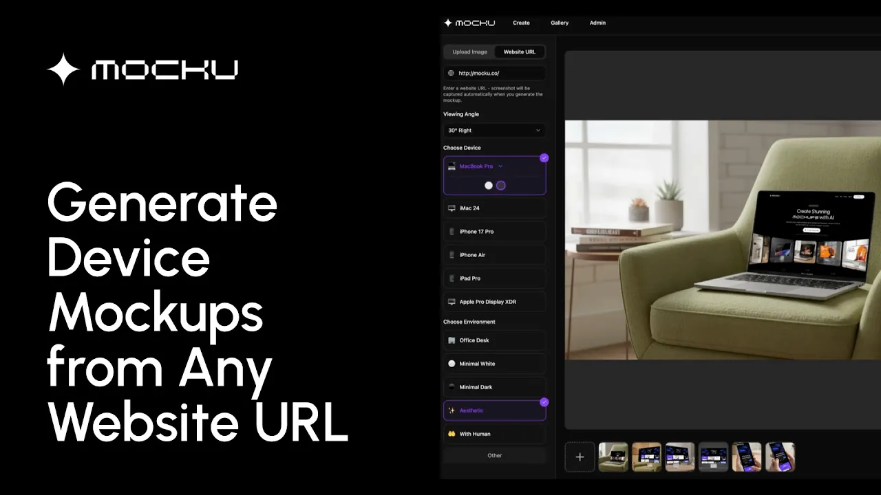 You can now create device mockups by simply entering a website URL — Mocku automatically captures a screenshot in the selected device size and generates your mockup instantly.